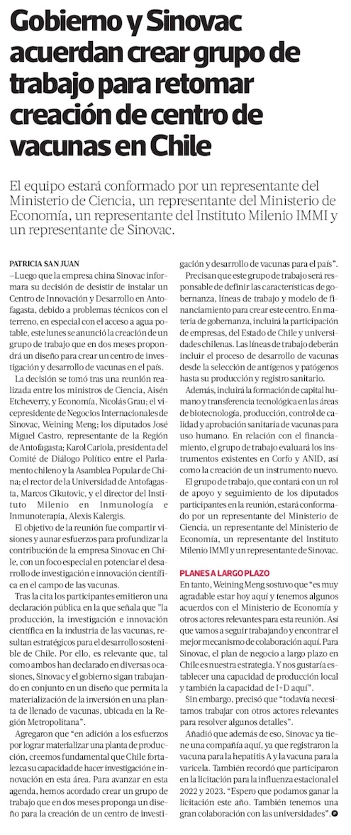 Gobierno y Sinovac buscan reactivar centro de desarrollo de vacunas y crean grupo de trabajo - (El Mercurio de Santiago)