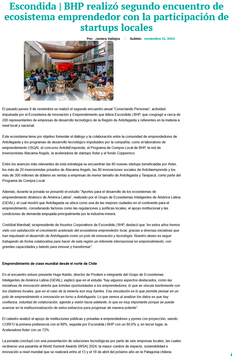 Escondida | BHP realizó segundo encuentro de ecosistema emprendedor con la participación de startups locales - (timeline)