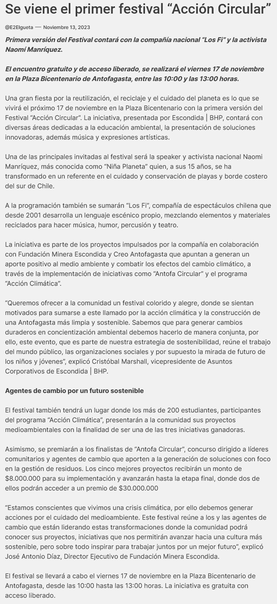 Escondida | BHP invita a la comunidad antofagastina a disfrutar del primer festival “Acción Circular” - (regionesnoticias.cl)