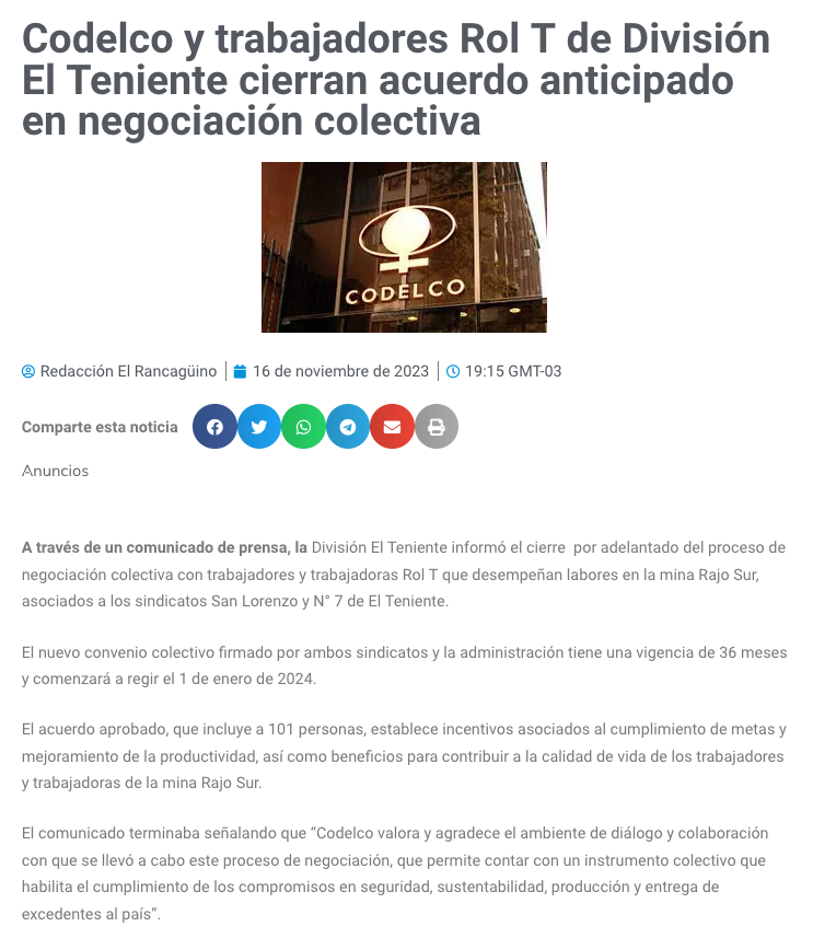Codelco cierra negociación colectiva con trabajadores de El Teniente - (El Mercurio de Santiago)