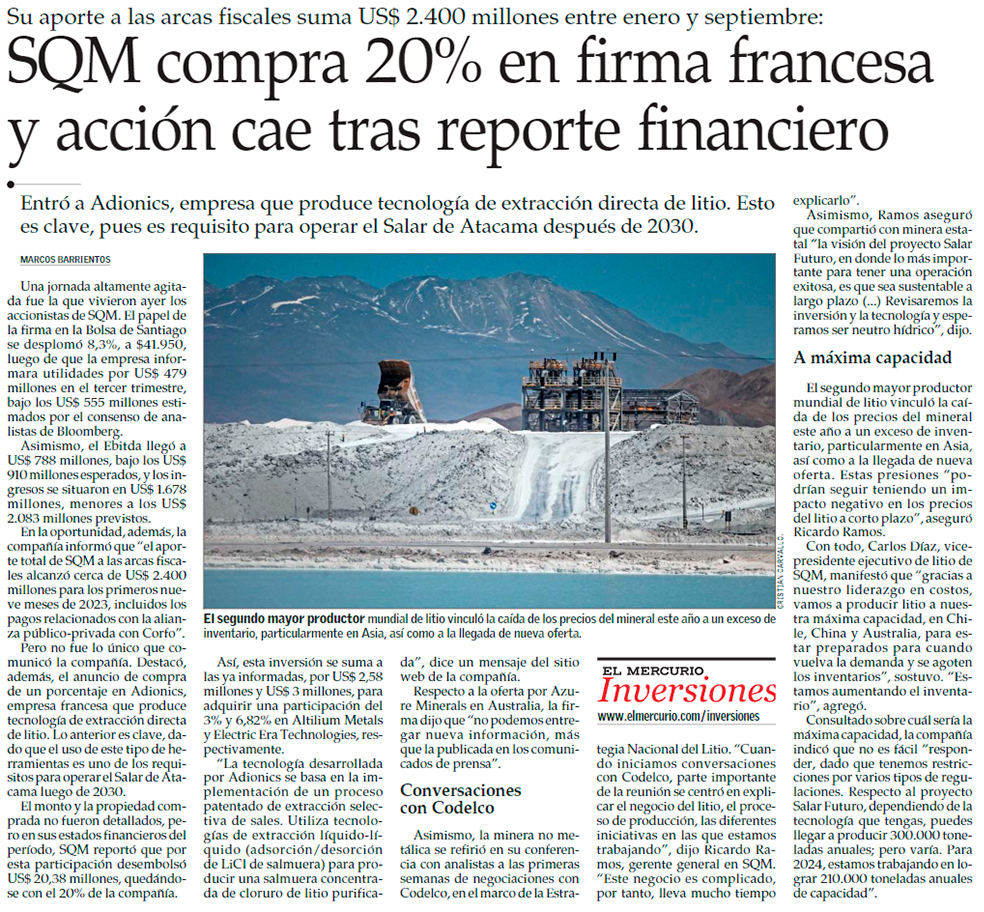 SQM adquirió compañía francesa de extracción directa de litio Adionics en US$ 20,3 millones - (DF Online)