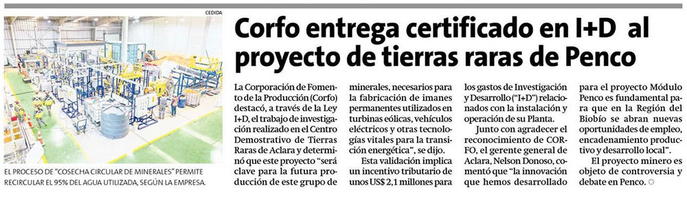 Corfo certifica proyecto de tierras raras en Penco y otorga US$ 2,1 millones en incentivos - (Diario Financiero)