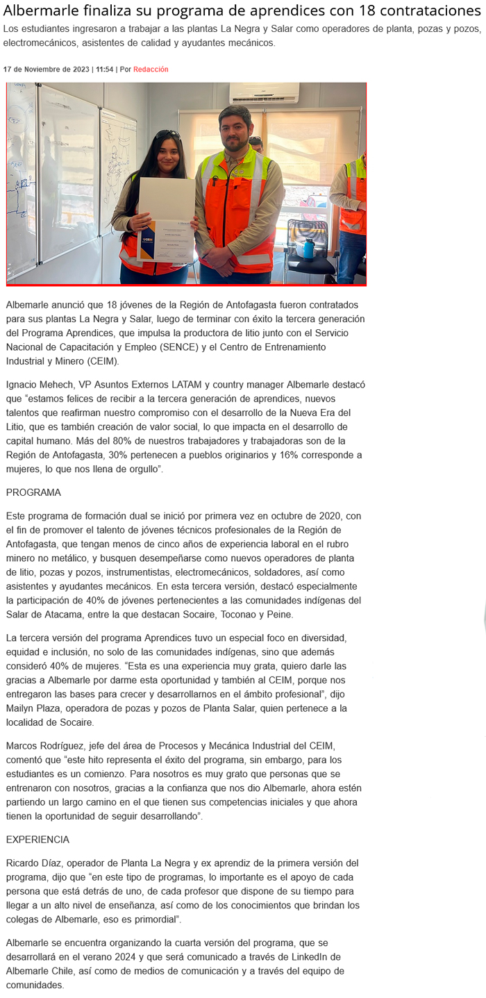 Albemarle finalizó programa de Aprendices con 18 contrataciones - (El Mercurio de Antofagasta)