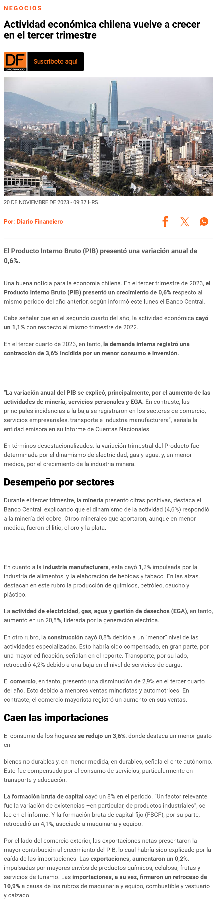 PIB vuelve a crecer en el tercer trimestre, pero mercado ve aún un débil 2024 - (Diario Financiero)