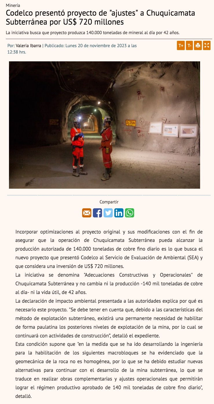 Chuqui Subterránea ingresa proyecto por US$720 millones - (El Mercurio de Antofagasta)