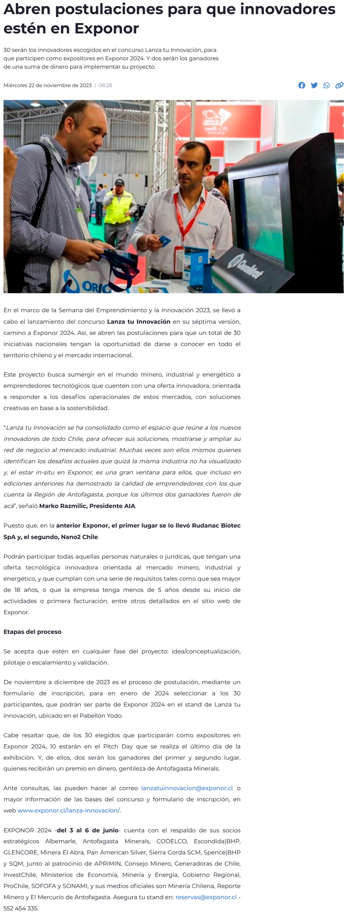 Abren postulaciones para que innovadores de todo el país estén en Exponor 2024 - (antofacity.cl)