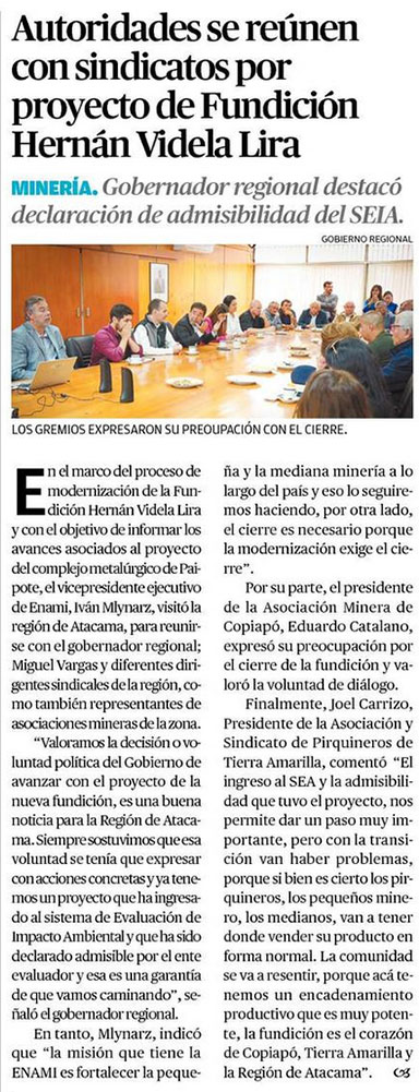 Gobernador de Atacama y Vicepresidente Ejecutivo de Enami abordaron avances asociados al proyecto de modernización de Fundición Hernán Videla Lira - (El Chañarcillo)