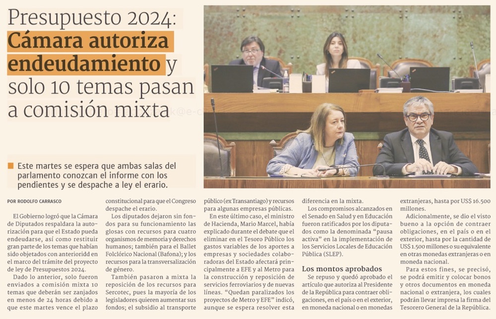 Comisión mixta deberá buscar acuerdo en trece materias para destrabar el Presupuesto 2024 - (El Mercurio de Santiago)