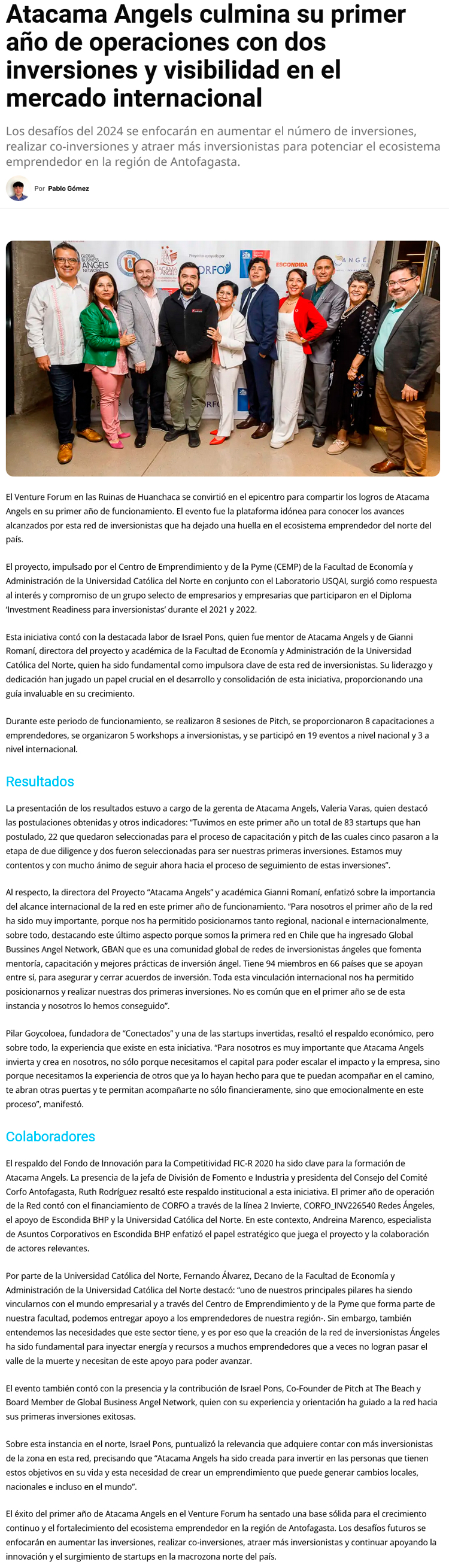 Atacama Angels culmina primer año de operaciones con 2 inversiones - (radioua.cl)