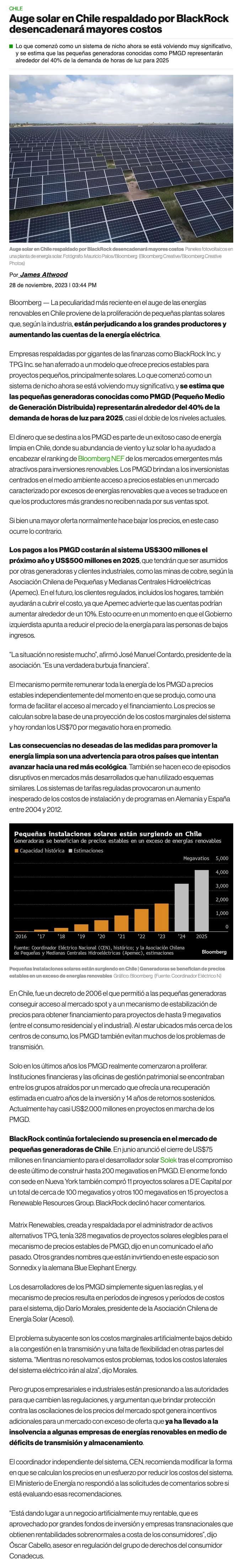 Asociación de centrales hidroeléctricas advierte que auge de energía solar en Chile traerá mayores costos para la industria y sus clientes - (DF Online)