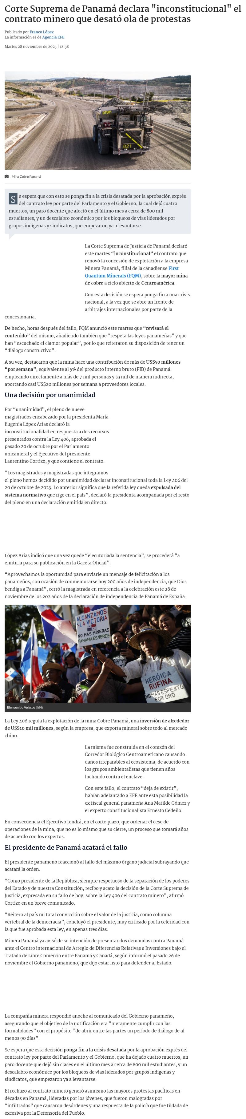 Fallo declara inconstitucional contrato minero en Panamá - (El Mercurio de Santiago)
