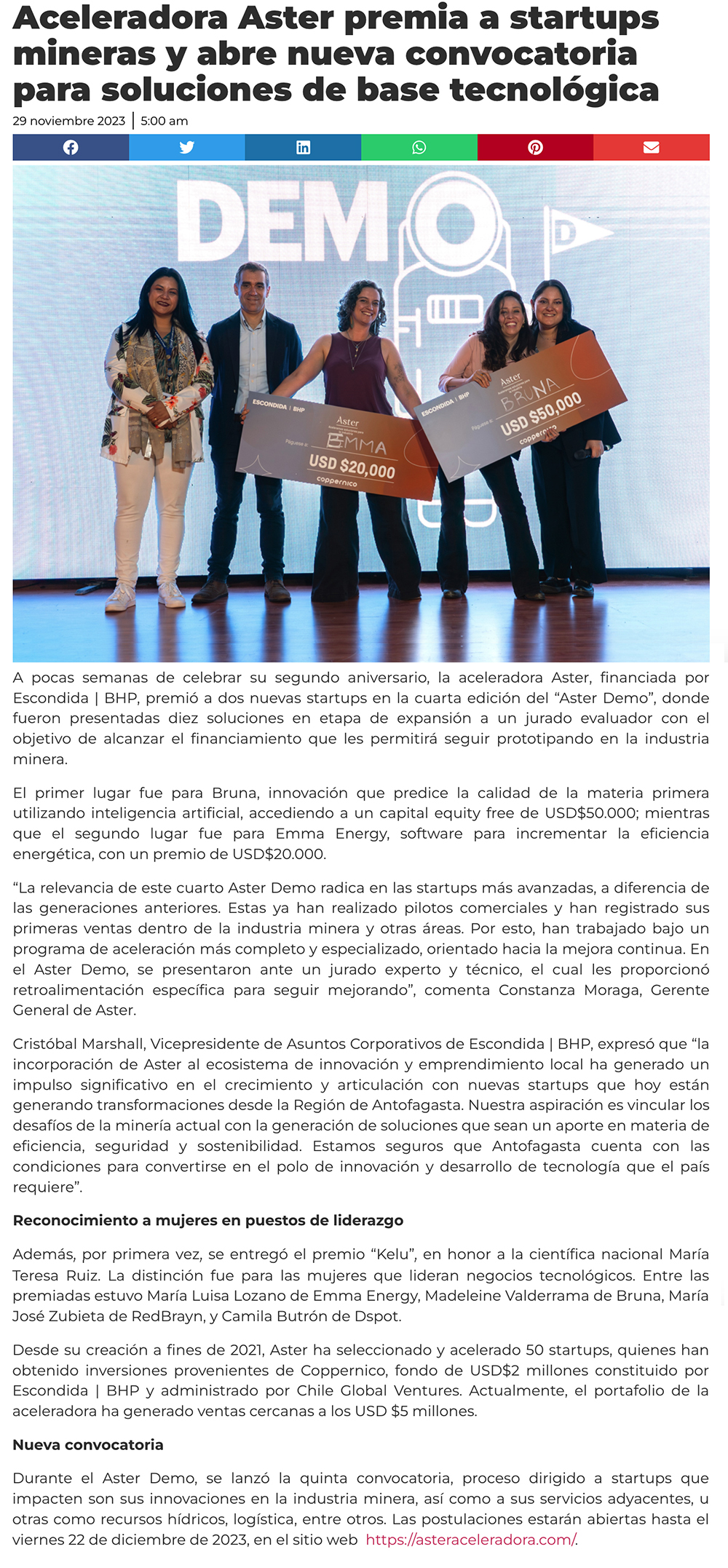 Aceleradora Aster premia a startups mineras y abre nueva convocatoria para soluciones de base tecnológica - (reporteminero)