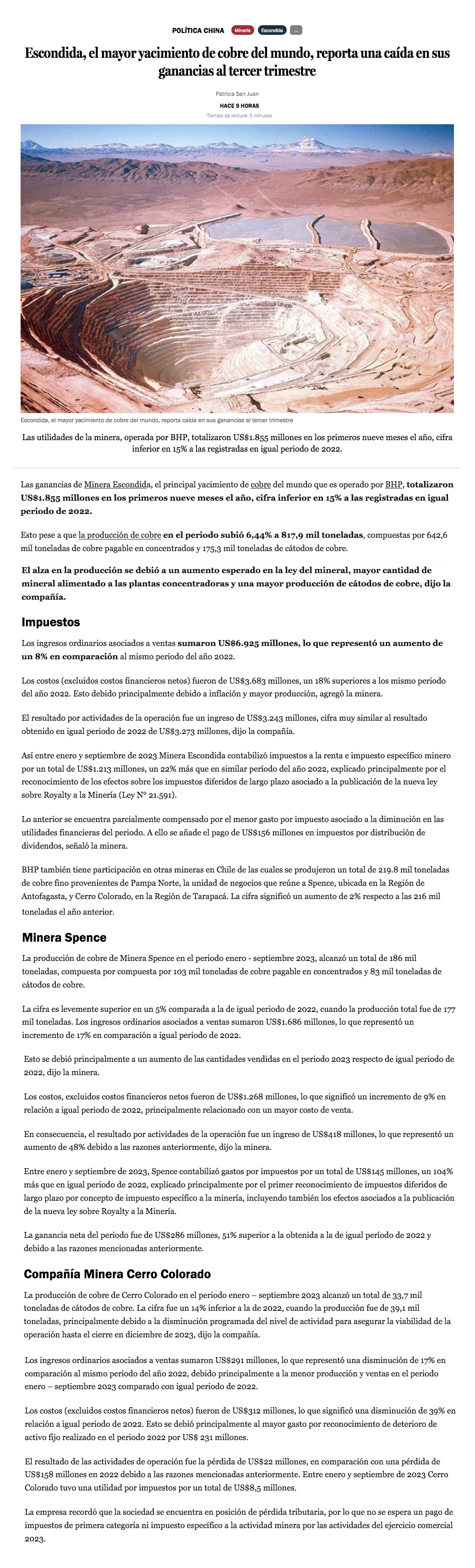 Sube aporte de Minera Escondida al fisco producto del nuevo royalty minero - (El Mercurio de Santiago)
