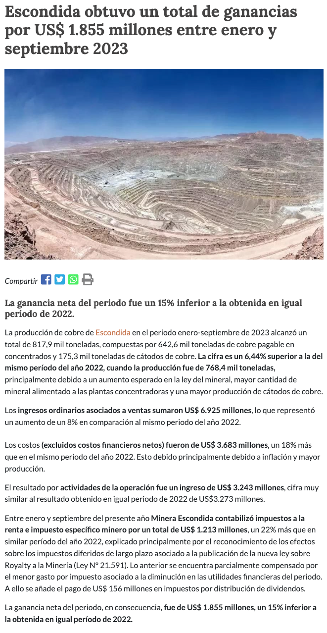 Minera Escondida da a conocer sus resultados financieros de enero-septiembre 2023 - (portalminero)
