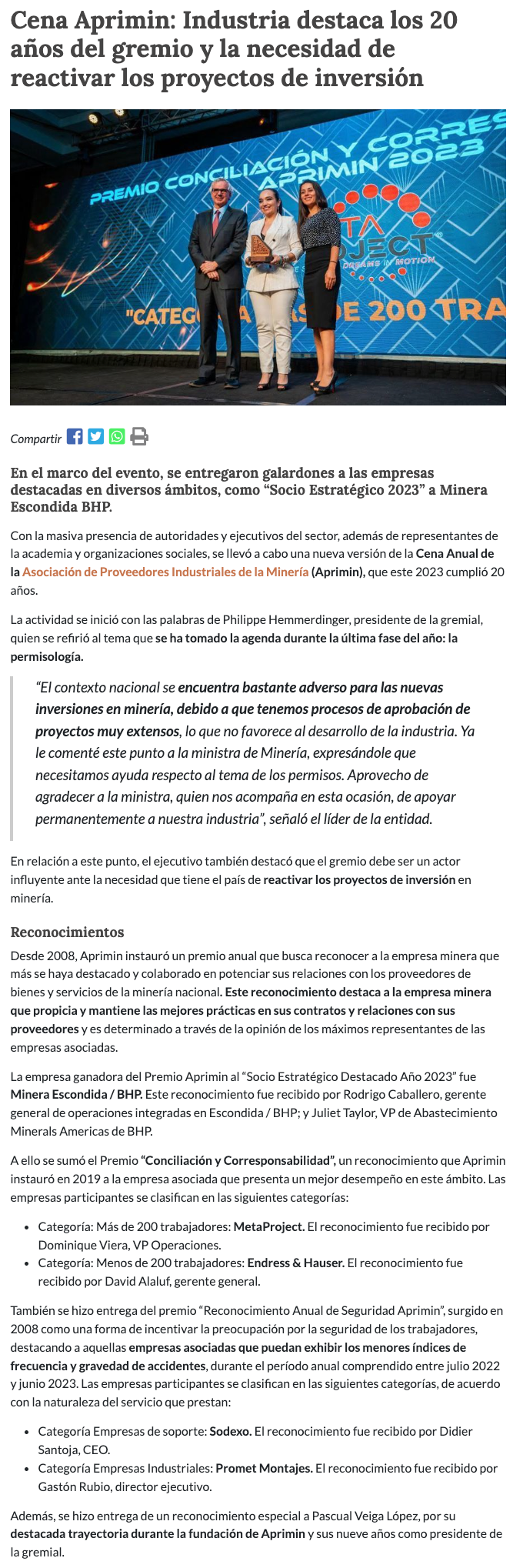 Cena Anual APRIMIN 2023: Industria destaca los 20 años del gremio y la necesidad de reactivar los proyectos de inversión - (mvcomunicaciones.cl)