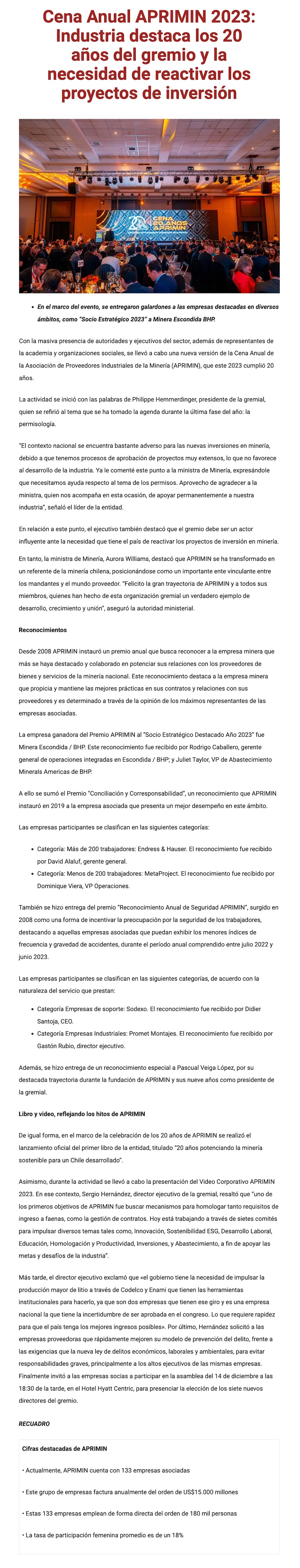 Cena Anual APRIMIN 2023: Industria destaca los 20 años del gremio y la necesidad de reactivar los proyectos de inversión - (mvcomunicaciones.cl)