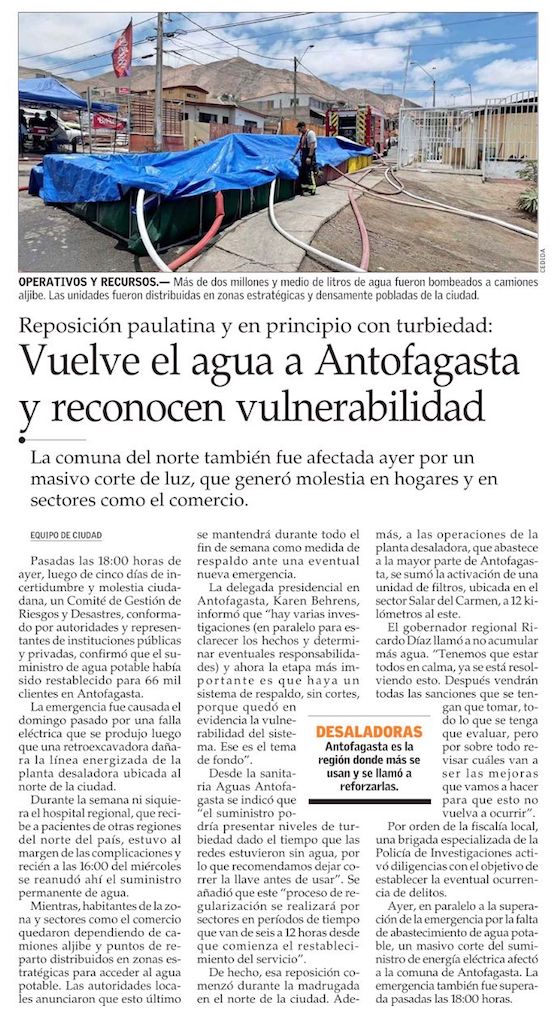 Fin a la crisis que mantuvo por 5 días sin agua potable a Antofagasta - (El Mercurio de Antofagasta)