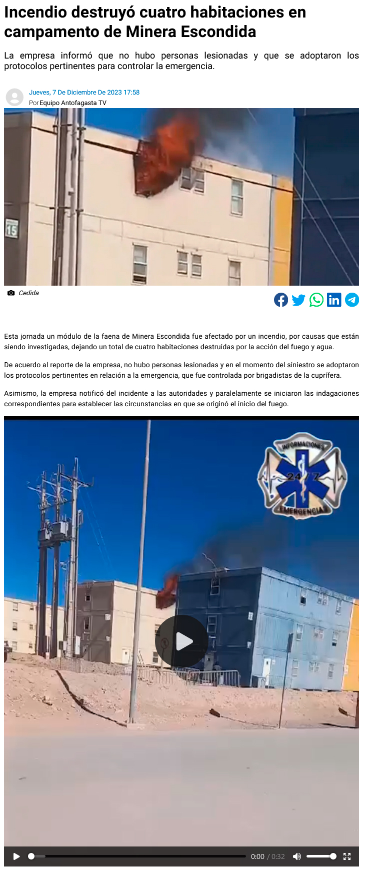 Incendio afectó un módulo de un campamento de Minera Escondida - (antofagastaaldia.cl)