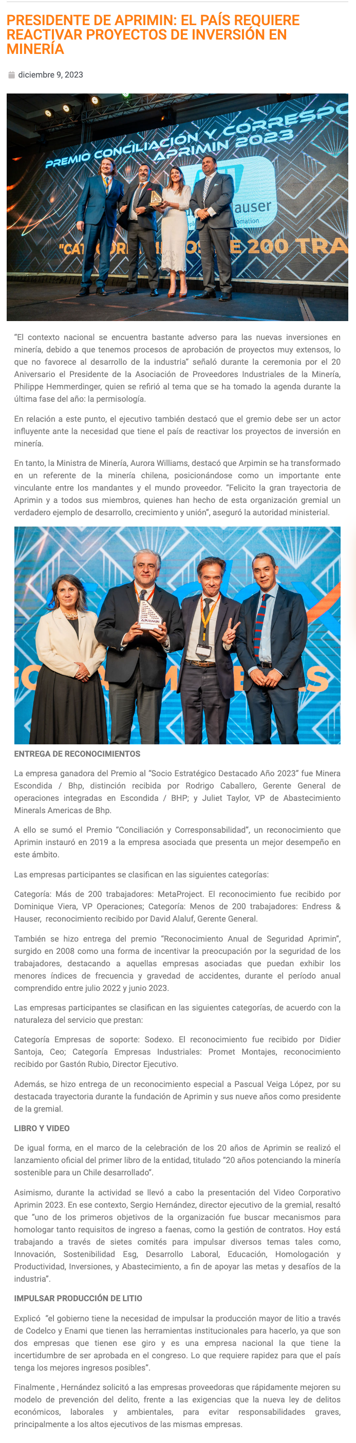 Cena Anual APRIMIN 2023: Industria destaca los 20 años del gremio y la necesidad de reactivar los proyectos de inversión - (mvcomunicaciones.cl)