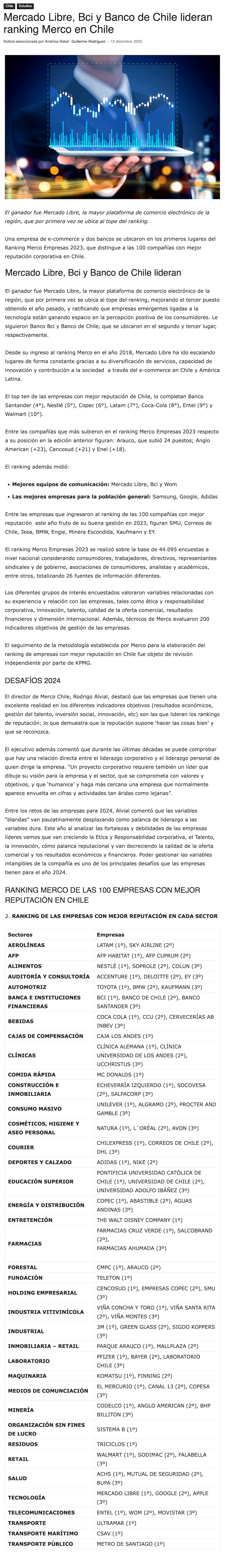 Merco Empresas 2023: Mercado Libre, Bci y Banco de Chile lideran ranking de las 100 compañías con mejor reputación en Chile - (Estrategia)