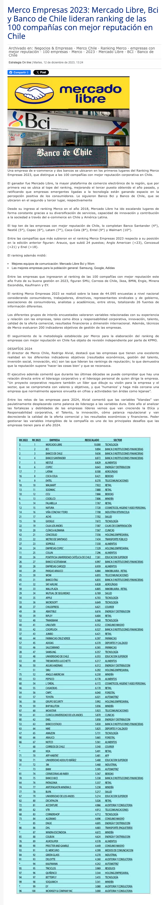 Mercado Libre, Bci y Banco de Chile lideran ranking Merco en Chile - (america-retail.com)