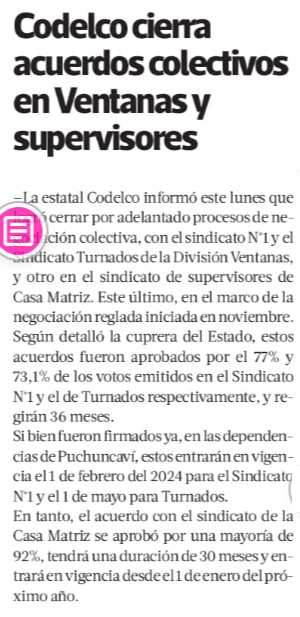 Codelco logra cerrar acuerdos de negociación de contrato con tres de sus sindicatos - (Diario Financiero)