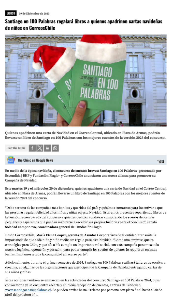 Santiago en 100 Palabras se une a CorreosChile e invita a apadrinar a niñas y niños en esta Navidad - (Adprensa.cl)