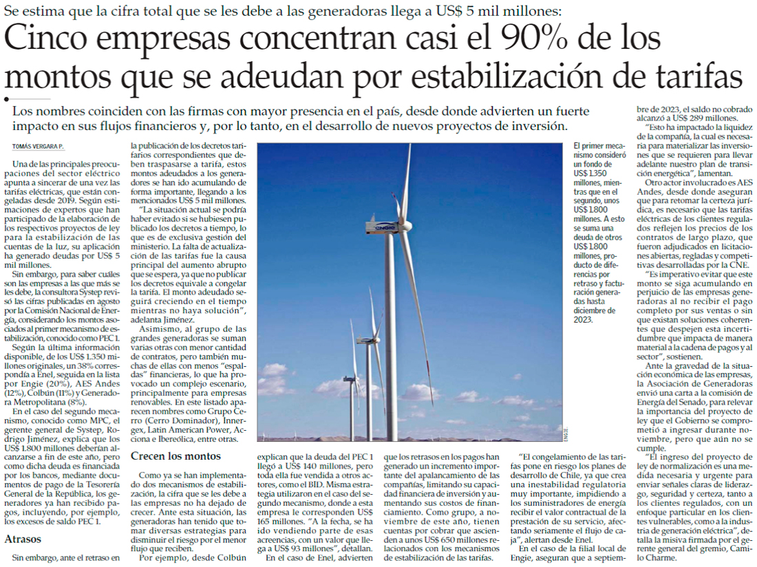 Tarifas: Cinco generadoras concentran casi 90% de montos que se les adeudan - (El Mercurio de Santiago)