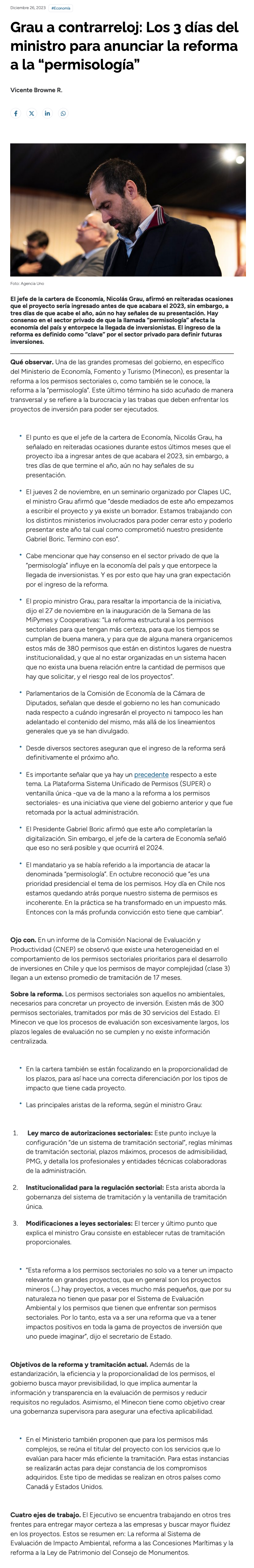 Pese a compromiso del Ejecutivo, el proyecto para combatir la “permisología” se posterga para 2024 - (El Mercurio de Santiago)