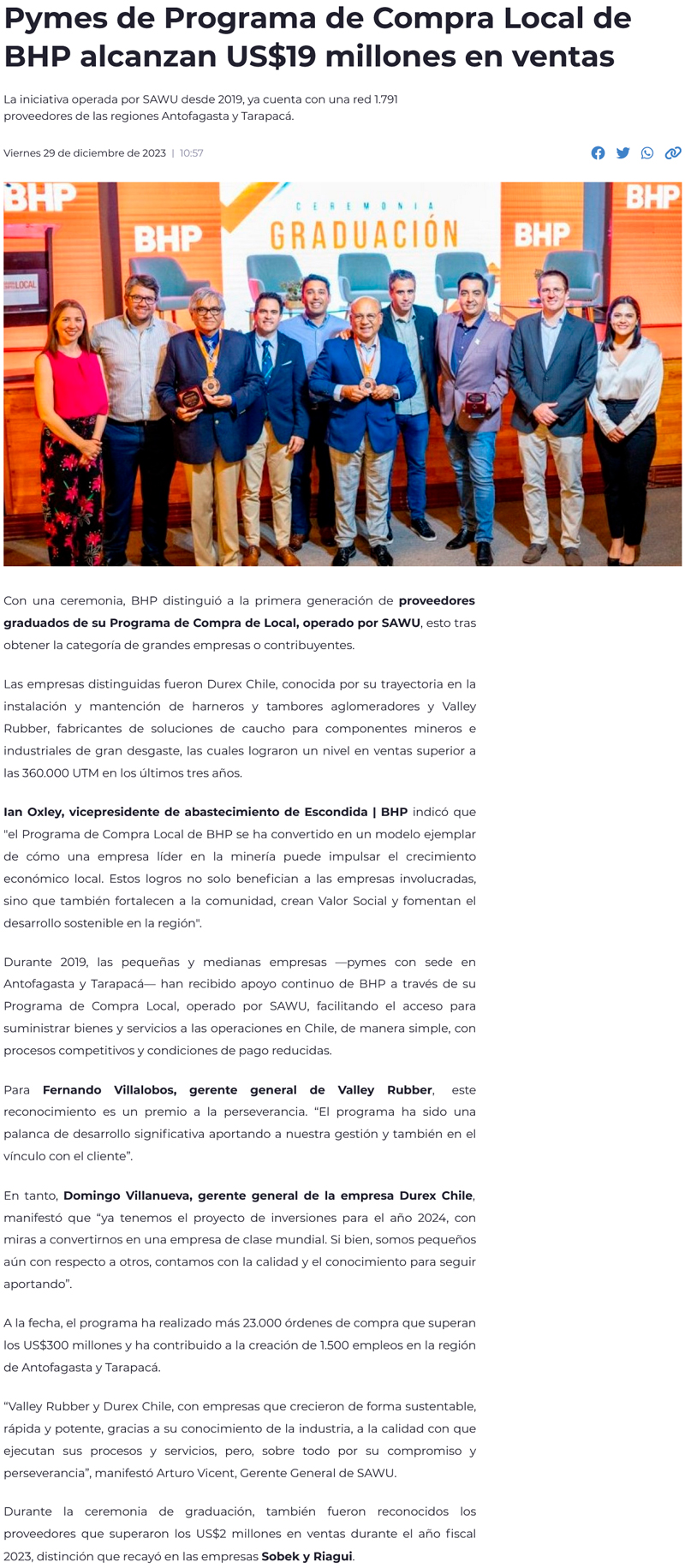 Pymes del Programa de Compra Local de BHP alcanzan categorÃa de grandes empresas con US$19 millones en ventas - (diarioangamos)