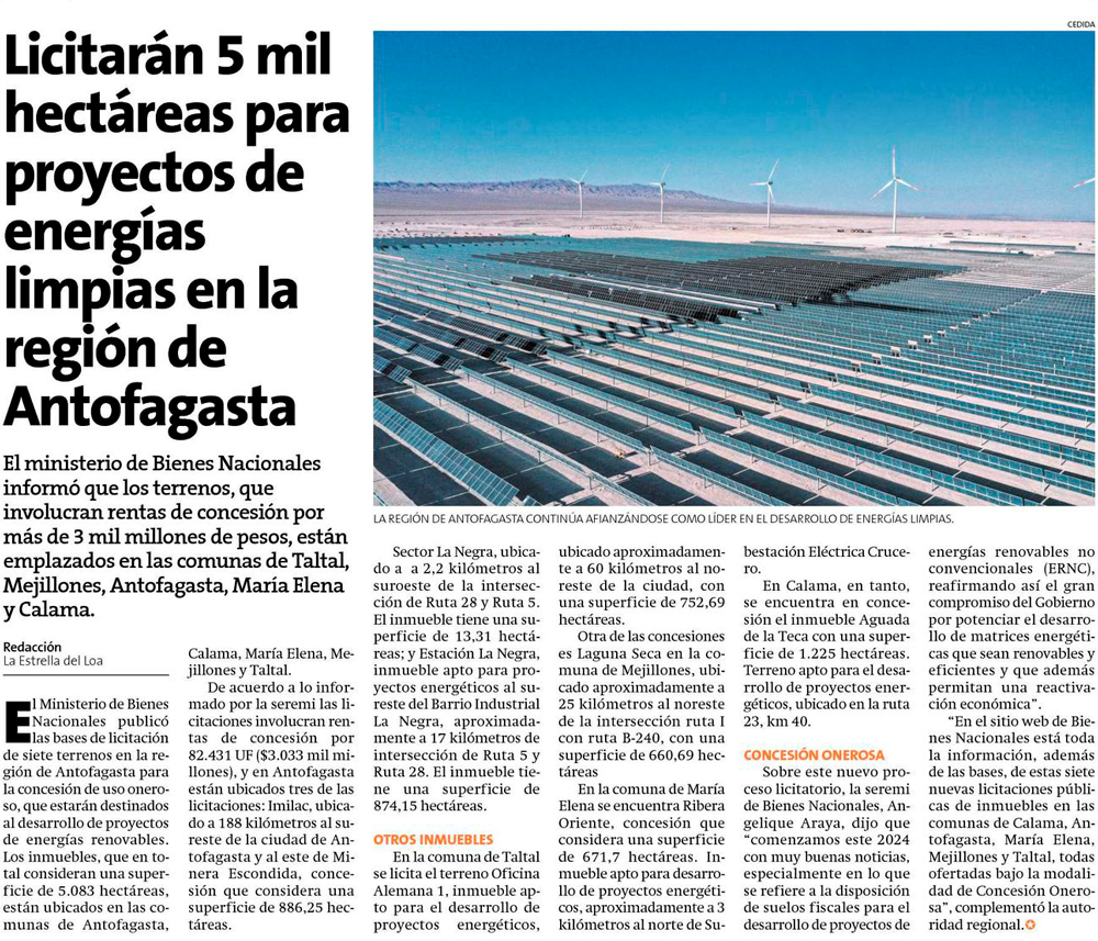 Licitarán 5 mil hectáreas para proyectos de energías limpias en la Región de Antofagasta - (Estrella de Tocopilla)