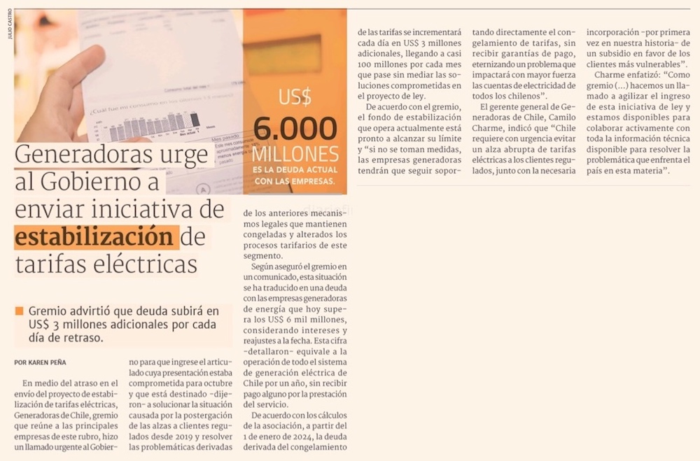 Deuda con generadoras supera los US$ 6 mil millones y Gobierno vuelve a retrasar proyectos clave - (El Mercurio de Santiago)