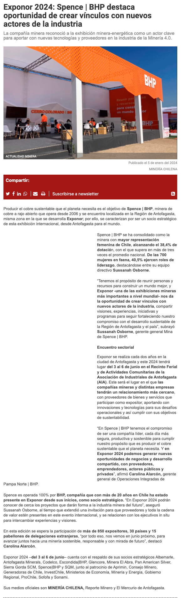 Spence|BHP destaca en Exponor la oportunidad de crear vínculos con nuevos actores de la industria - (mvcomunicaciones.cl)