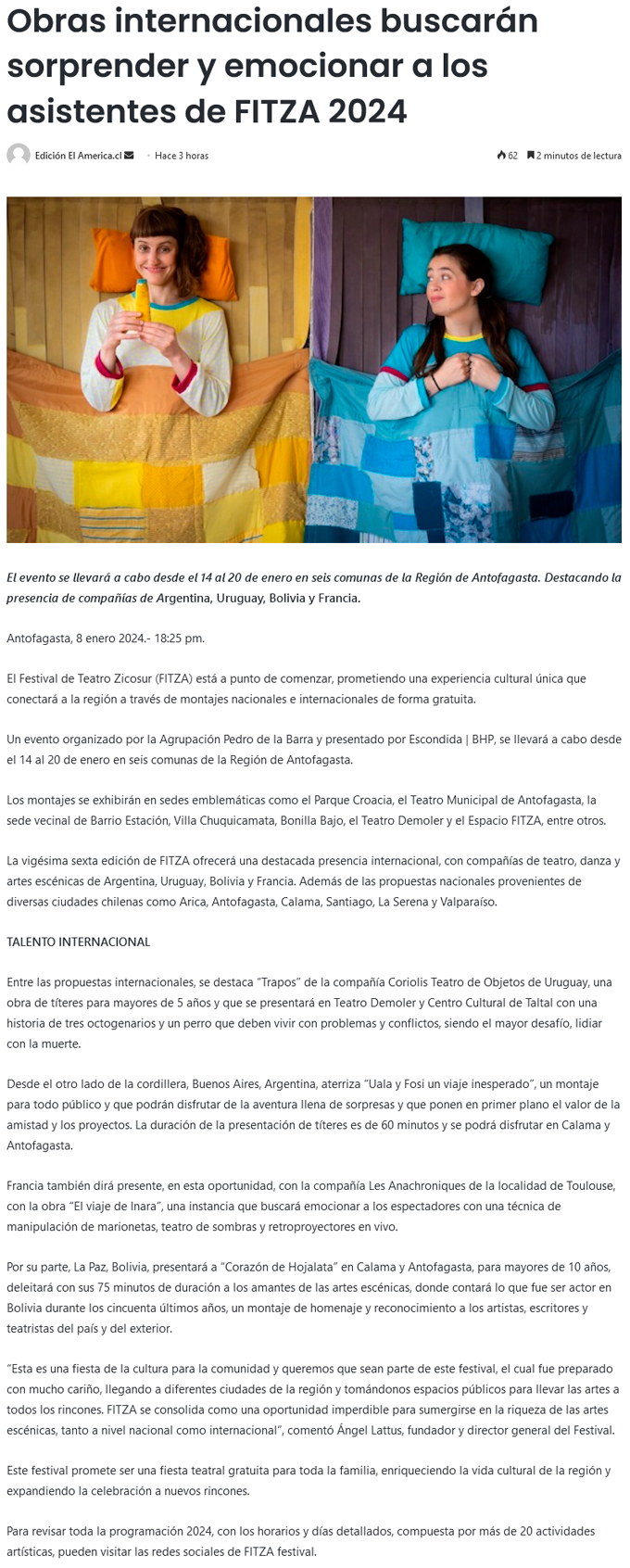 Obras internacionales buscarán sorprender a los asistentes de FITZA 2024 - (El Mercurio de Antofagasta)