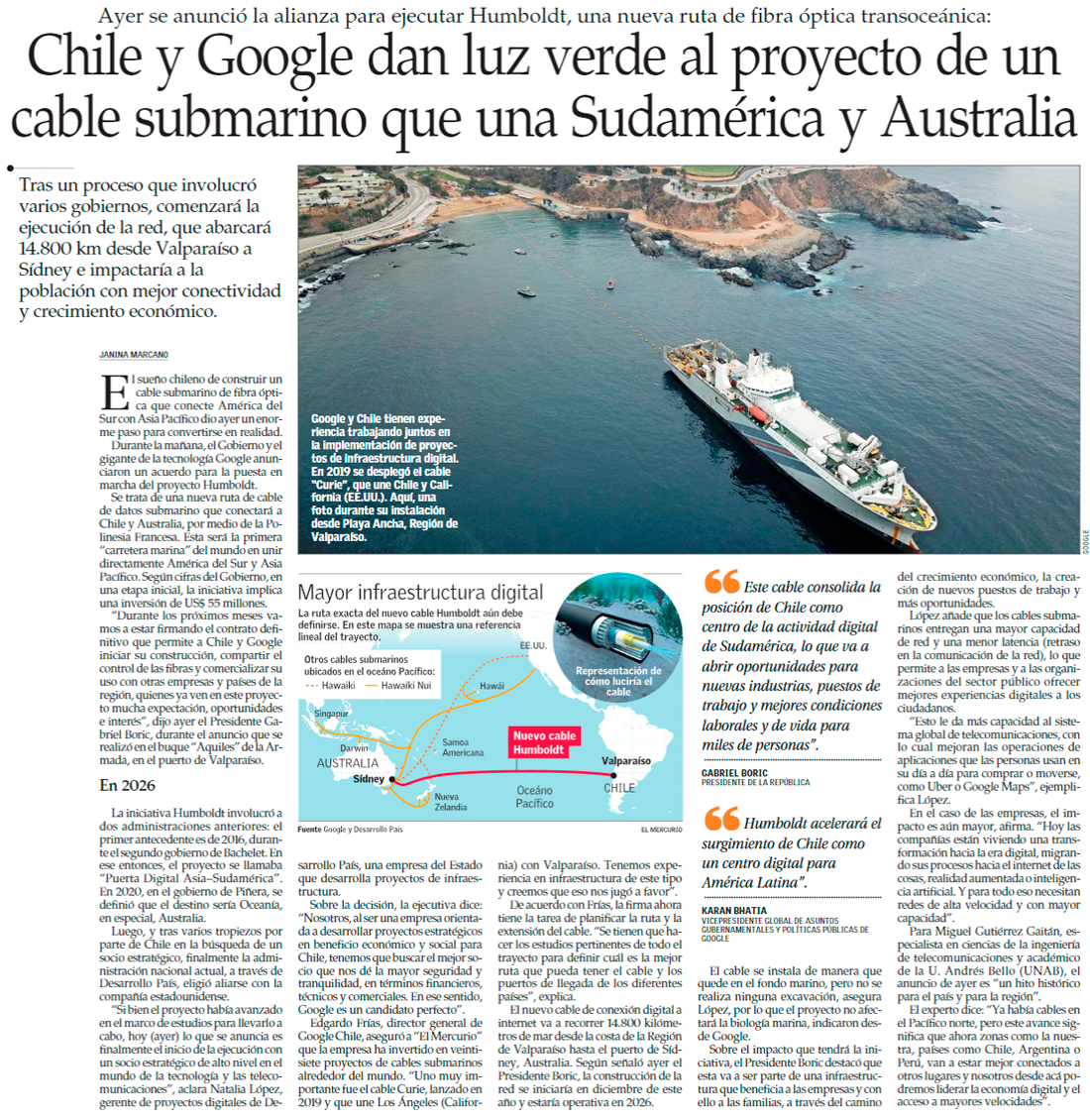 Google instala en Chile nuevo cable submarino que conectará América Latina con el Asia-Pacífico - (Diario Financiero)