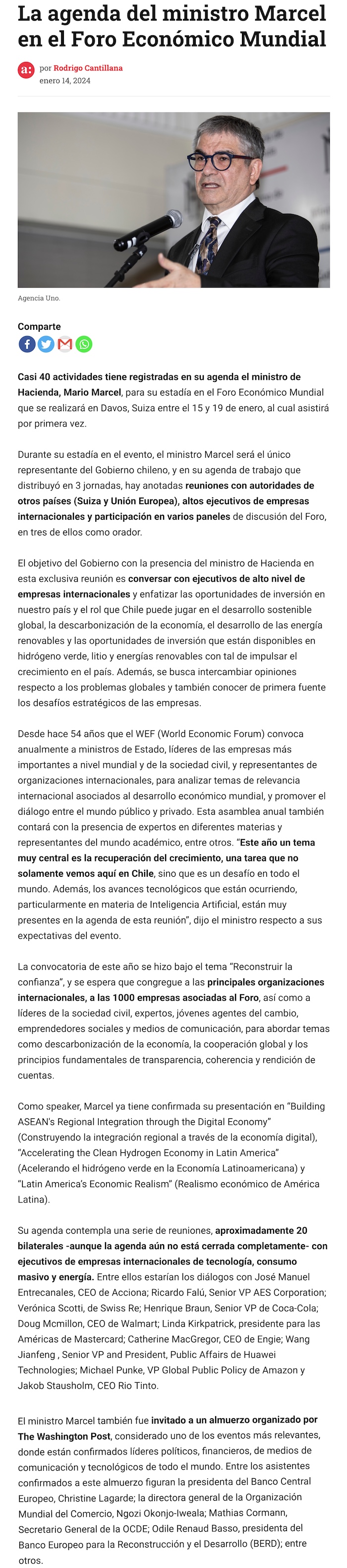 La agenda del ministro Marcel en su primera visita a Davos: incluye almuerzo con el CEO de JP Morgan y la presidenta del Banco Central europeo - (DF Online)