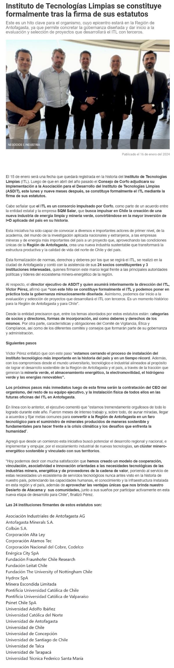 Hito para el país y la Región de Antofagasta: Se constituye formalmente el Instituto de Tecnologías Limpias ITL - (mineriayfuturo.cl)
