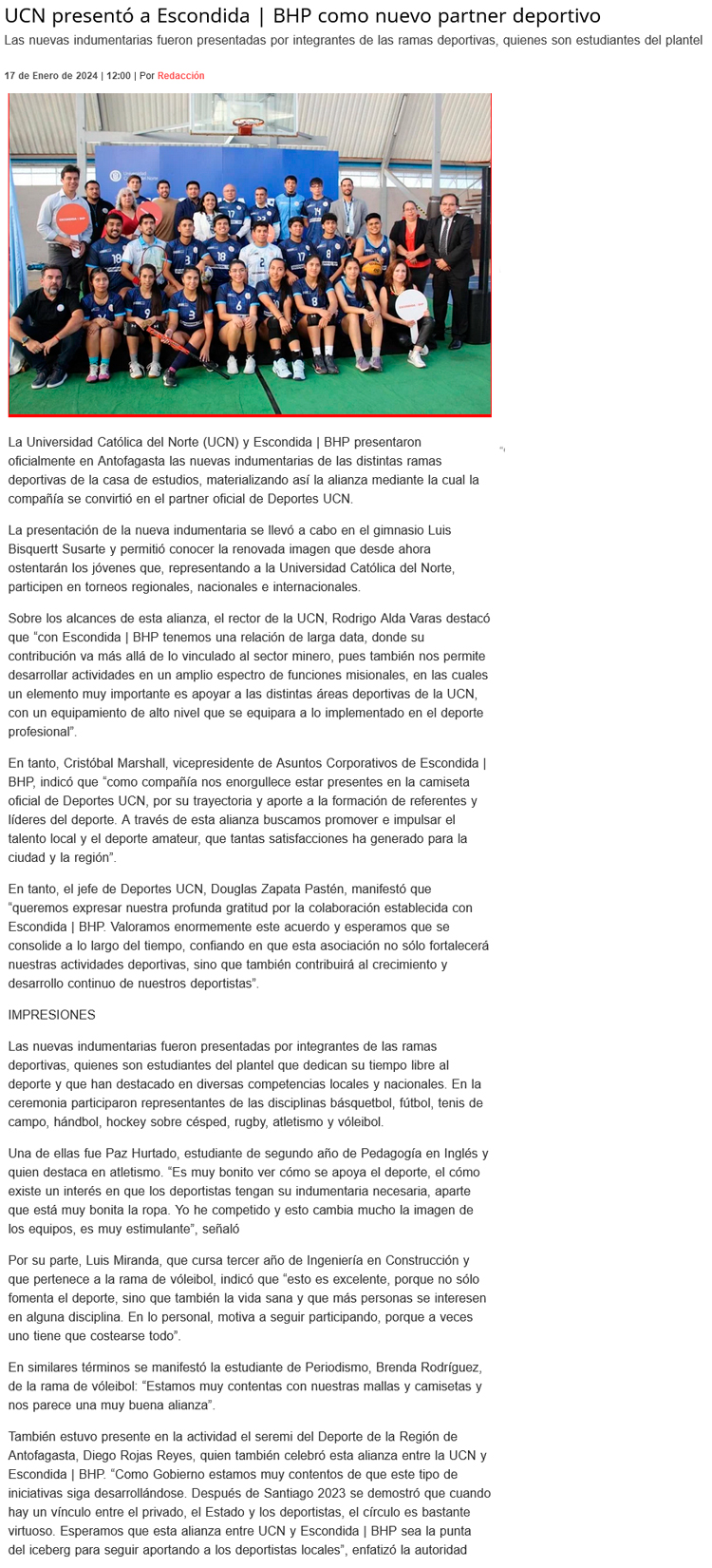 UCN presentó a Escondida | BHP como nuevo partner deportivo - (poderyliderazgo)