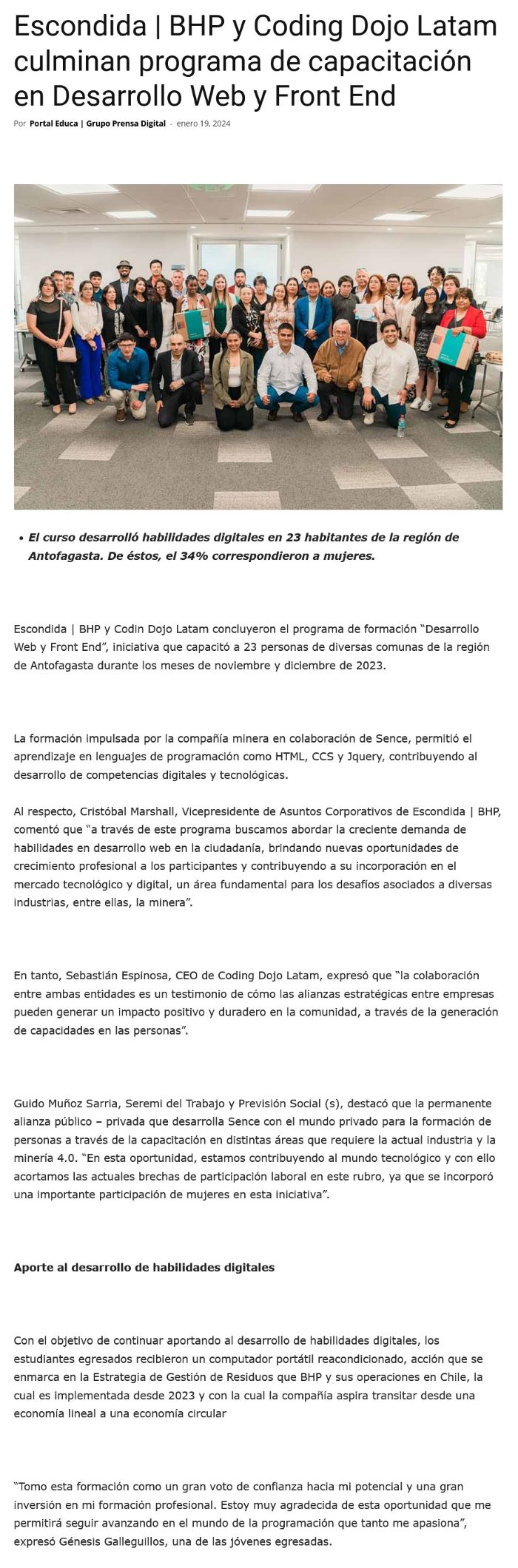 Escondida | BHP y Coding Dojo Latam culminan programa de capacitación en Desarrollo Web y Front End - (redimin)