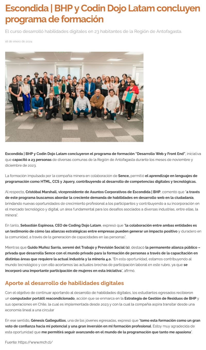 Escondida | BHP y Coding Dojo Latam culminan programa de capacitación en Desarrollo Web y Front End - (portaleduca.cl)