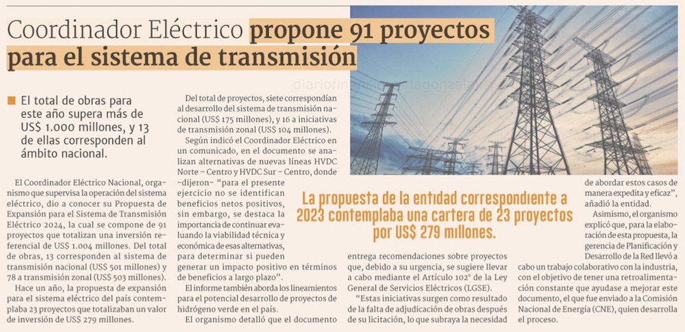 C. Eléctrico propone obras por sobre US$ 1.000 mills. - (El Mercurio de Santiago)