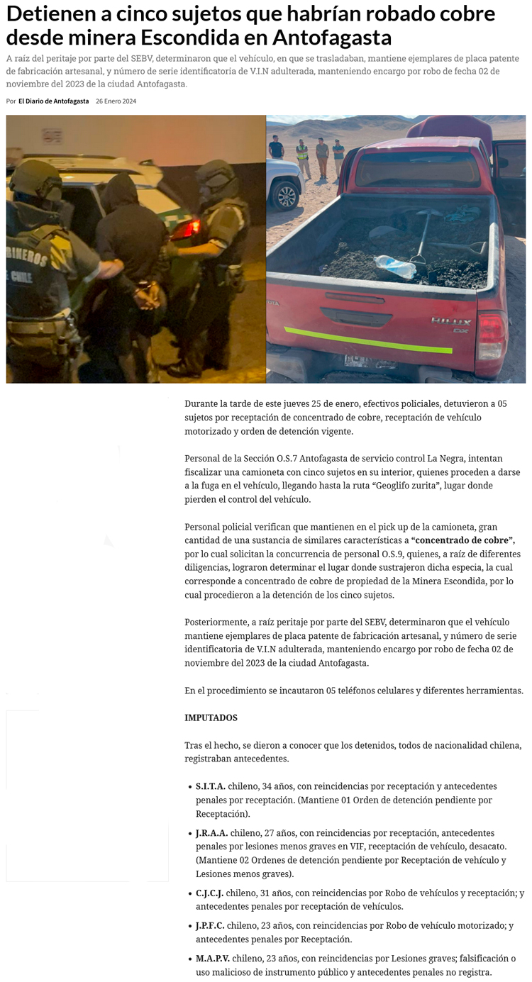 Capturan a banda robando cobre desde minera Escondida en Antofagasta: Trasladaban el mineral en auto robado - (soyantofagasta)