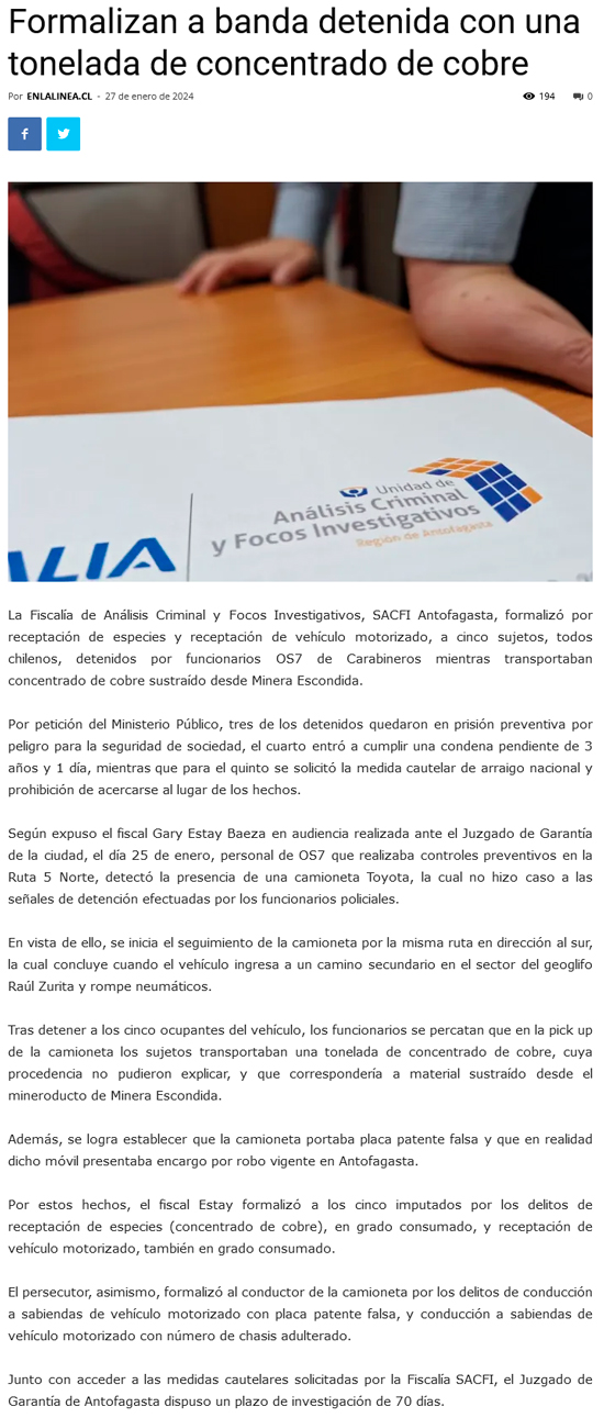 Fiscalía SACFI Antofagasta formaliza a cinco individuos por receptación de cobre sustraído de minera escondida y robo de vehículo - (diarioangamos)