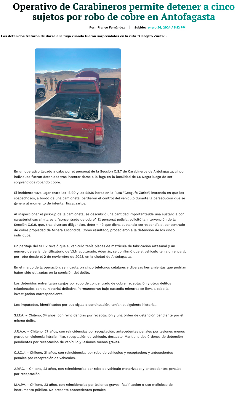 Detienen a cinco sujetos que habrĂan robado cobre desde minera Escondida en Antofagasta - (diarioantofagasta)