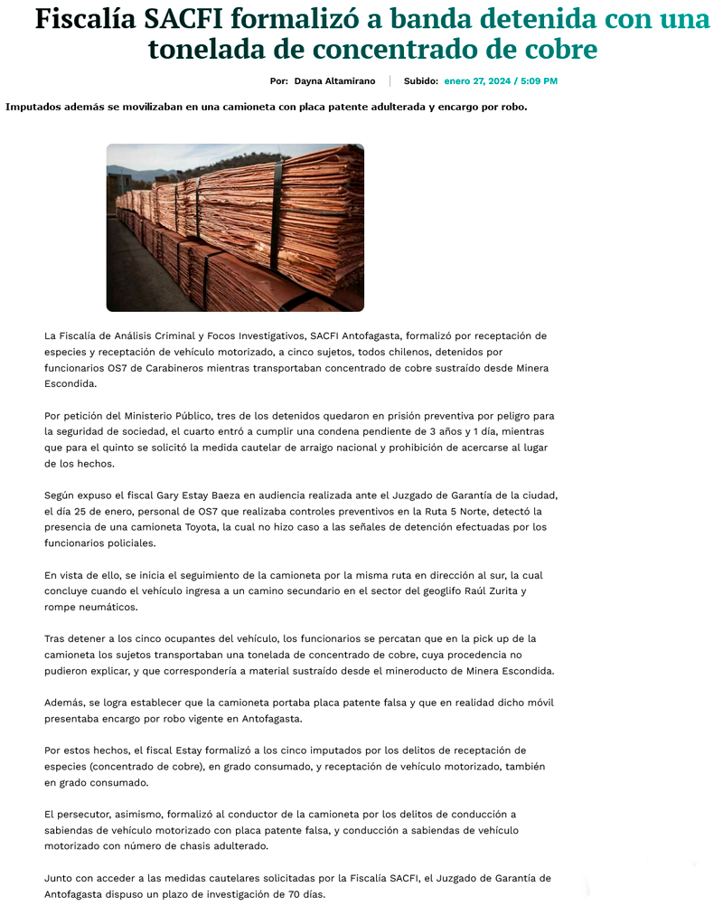 Fiscalía SACFI Antofagasta formaliza a cinco individuos por receptación de cobre sustraído de minera escondida y robo de vehículo - (diarioangamos)
