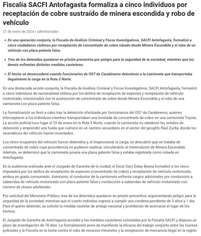 Fiscalía SACFI formalizó a banda detenida con una tonelada de concentrado de cobre - (desiertofm.cl)