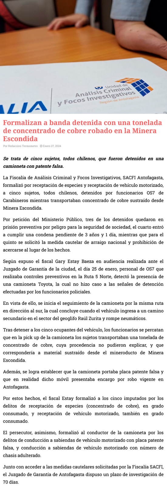 Fiscalía SACFI Antofagasta formaliza a cinco individuos por receptación de cobre sustraído de minera escondida y robo de vehículo - (diarioangamos)