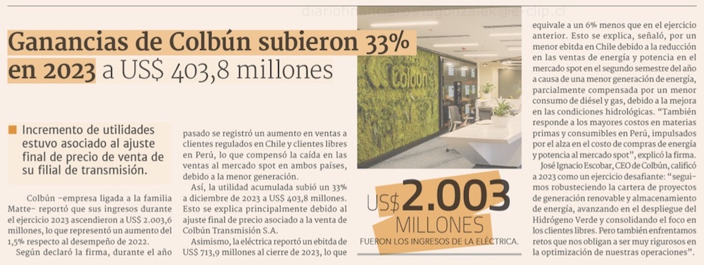 ColbĂșn cierra 2023 con un alza de 30% en sus ganancias - (El Mercurio de Santiago)