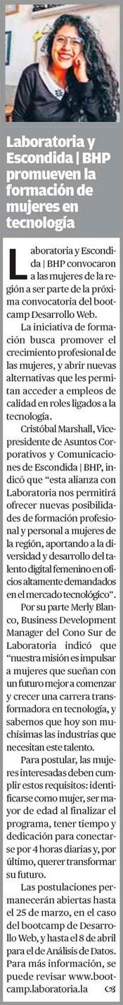 Laboratoria y Escondida | BHP promueven la formación de mujeres en tecnología - (El Mercurio de Antofagasta)