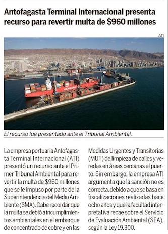 Empresa portuaria presenta reclamo ante al 1TA para revertir multa de $960 millones - (El Mercurio de Antofagasta)